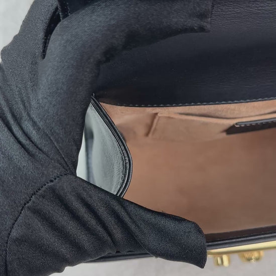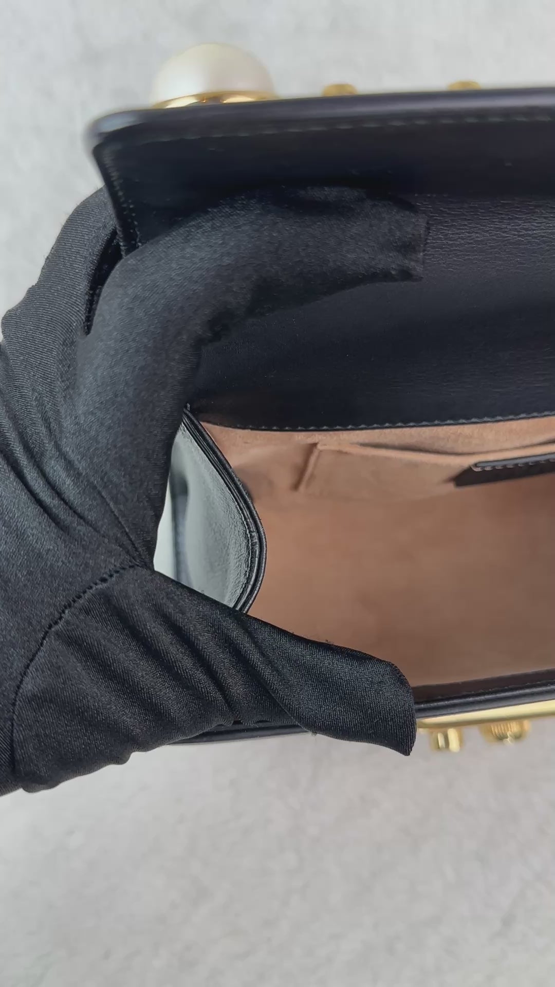 Material: Leather (calf leather) with gold-toned hardware and pearl studs